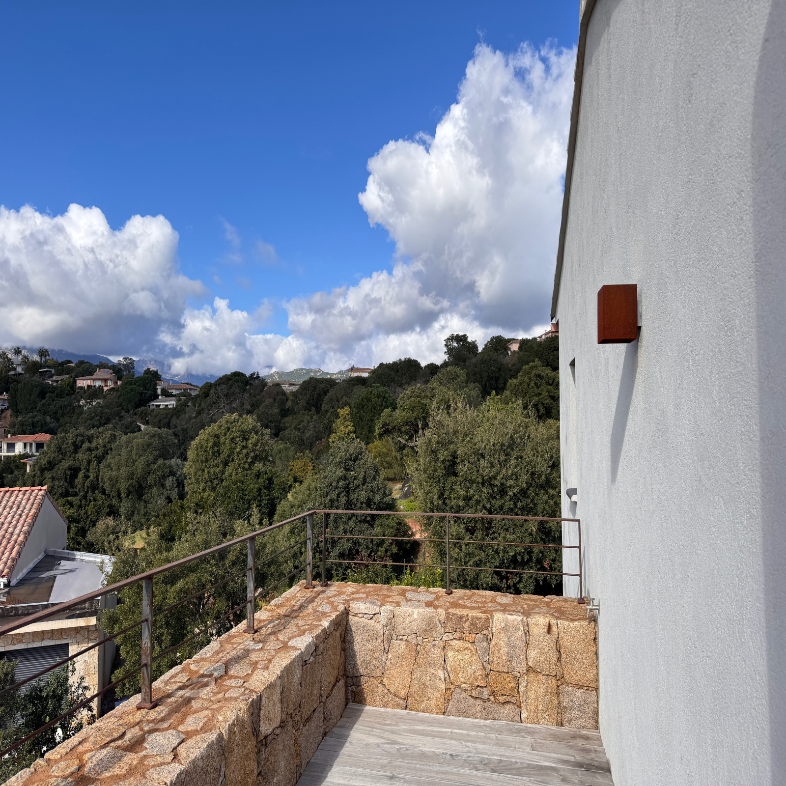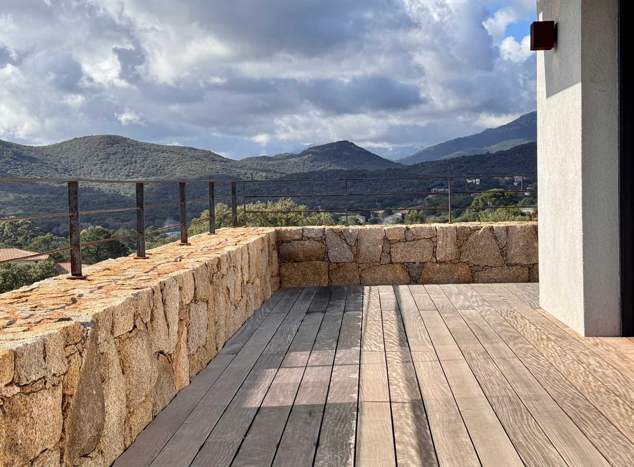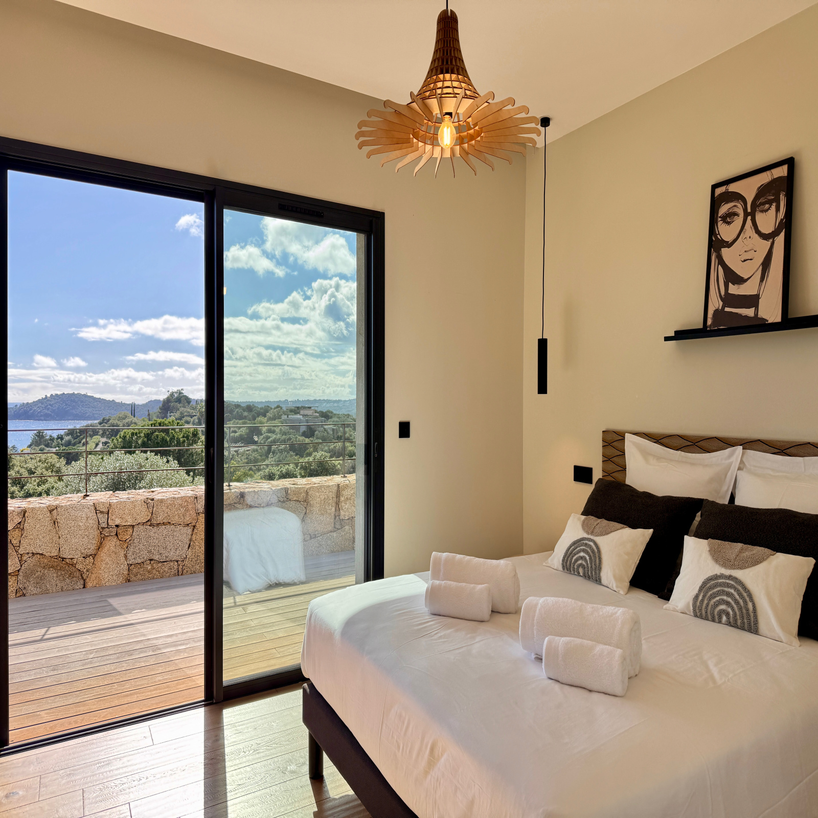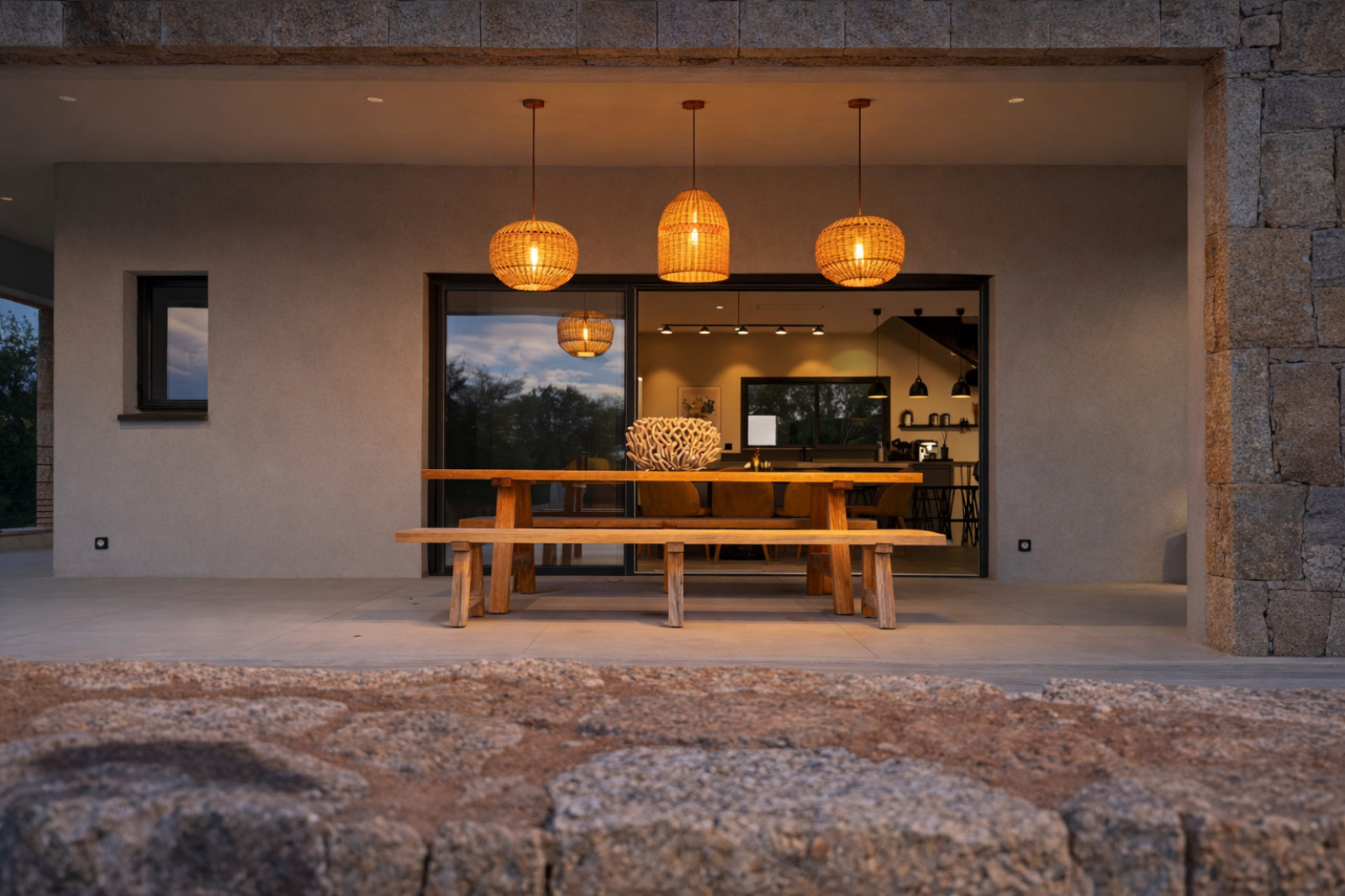 L’ensemble s’ouvre sur une grande terrasse partiellement couverte, offrant une vue mer dégagée,idéale pour les repas en extérieur, les moments de détente et les soirées face au paysage corse.