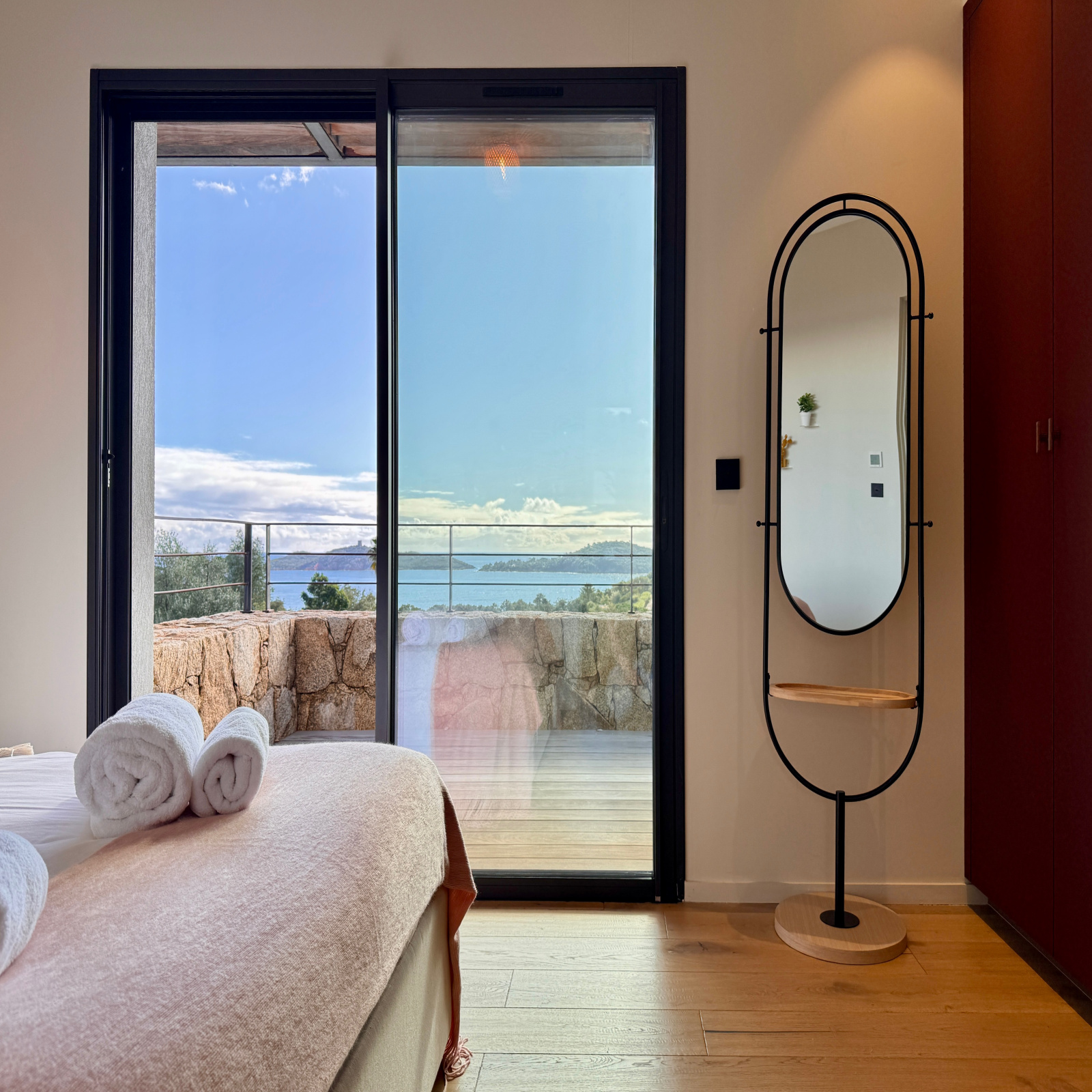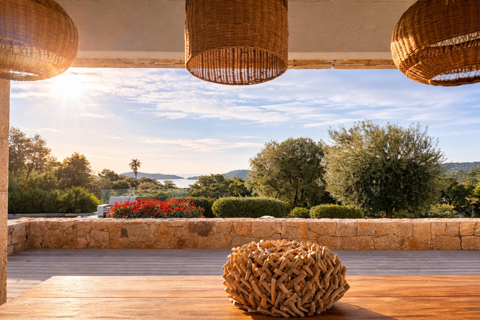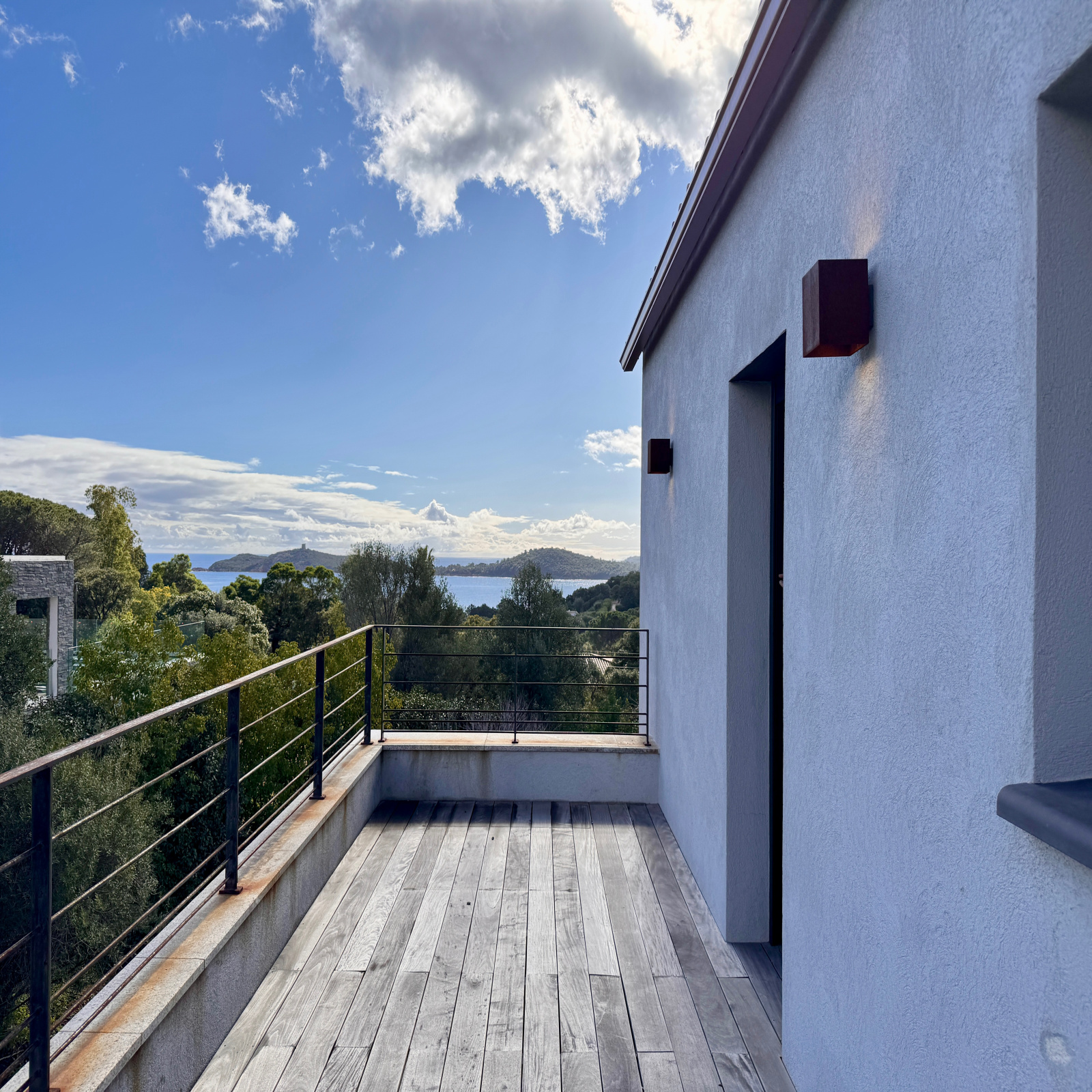 L’ensemble s’ouvre sur une grande terrasse partiellement couverte, offrant une vue mer dégagée,idéale pour les repas en extérieur, les moments de détente et les soirées face au paysage corse.