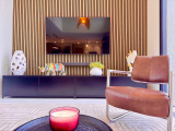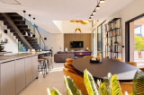 La vaste pièce de vie, baignée de lumière grâce à de larges ouvertures, se compose :