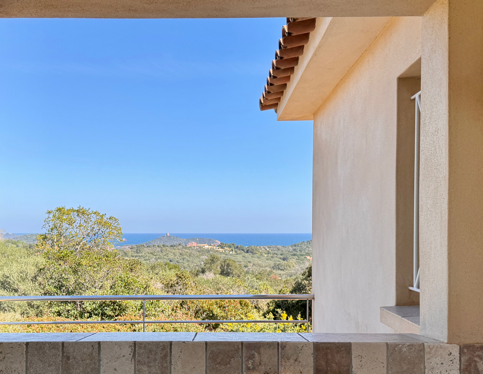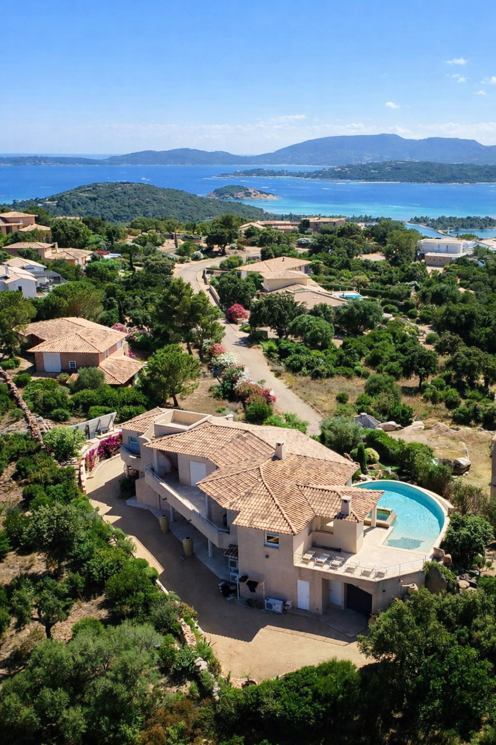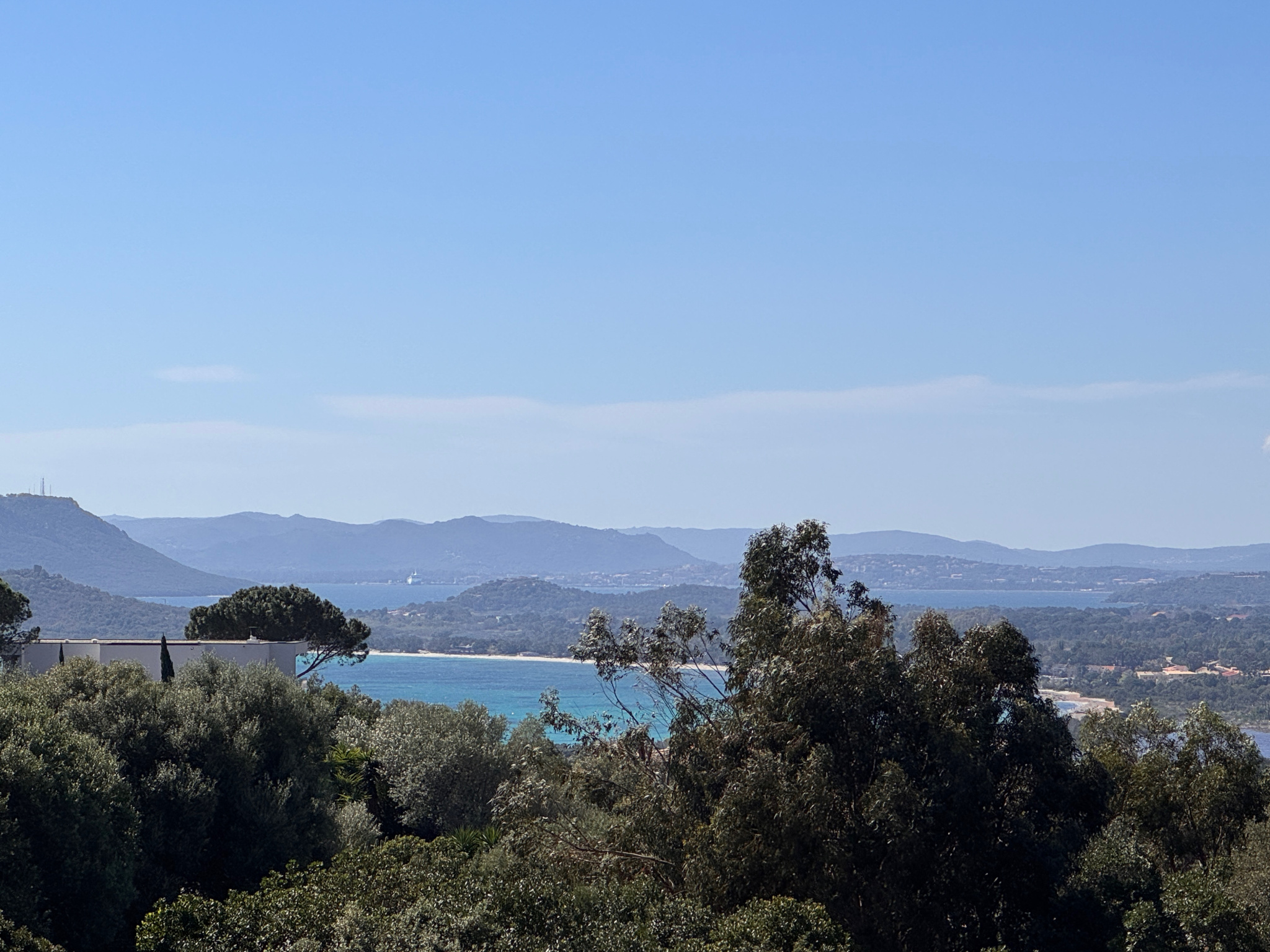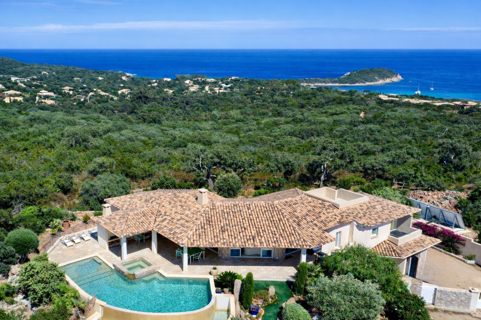 En position dominante, la villa offre une vue panoramique exceptionnelle sur la baie de Saint-Cyprien, le golfe de Porto-Vecchio, Pinarello et Capicciola. Un panorama dont on profite depuis chaque pièce.
