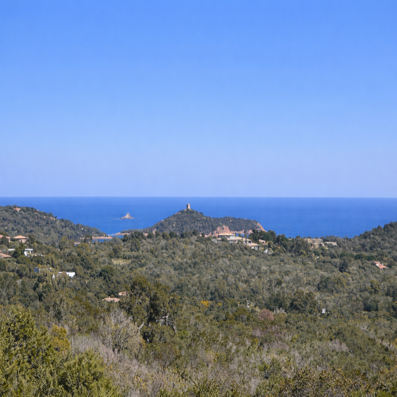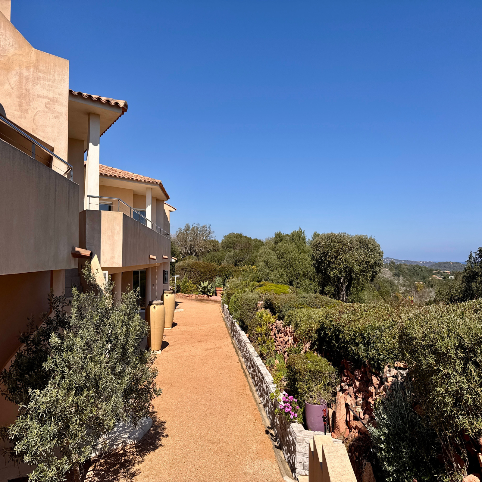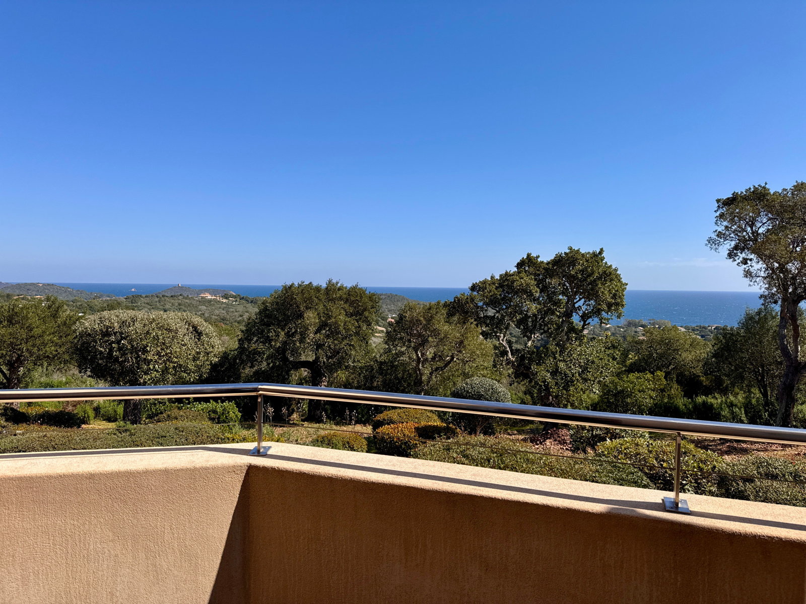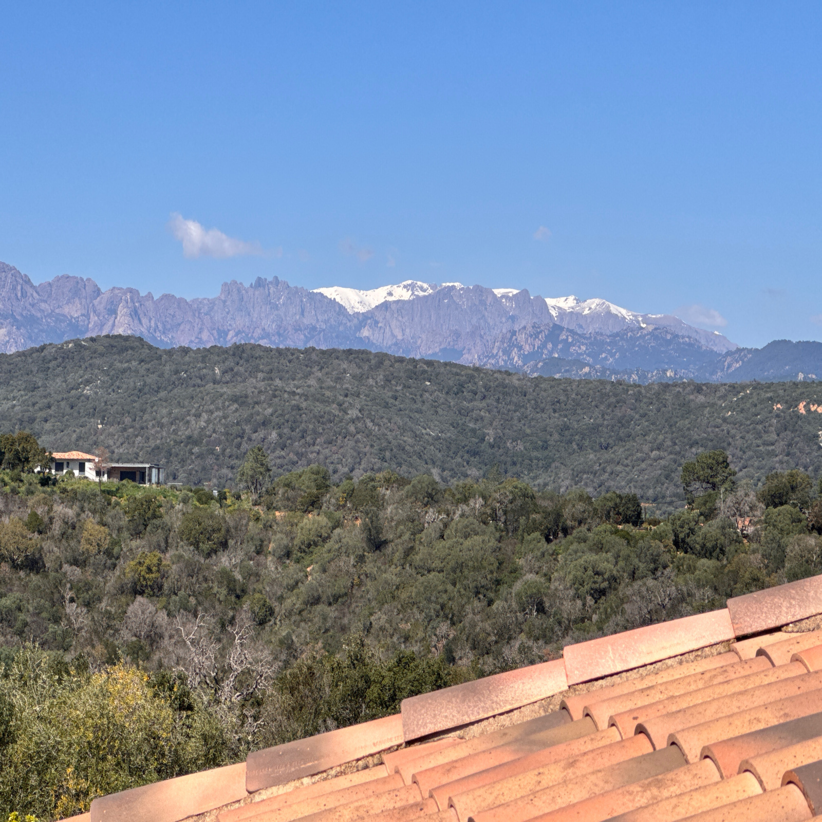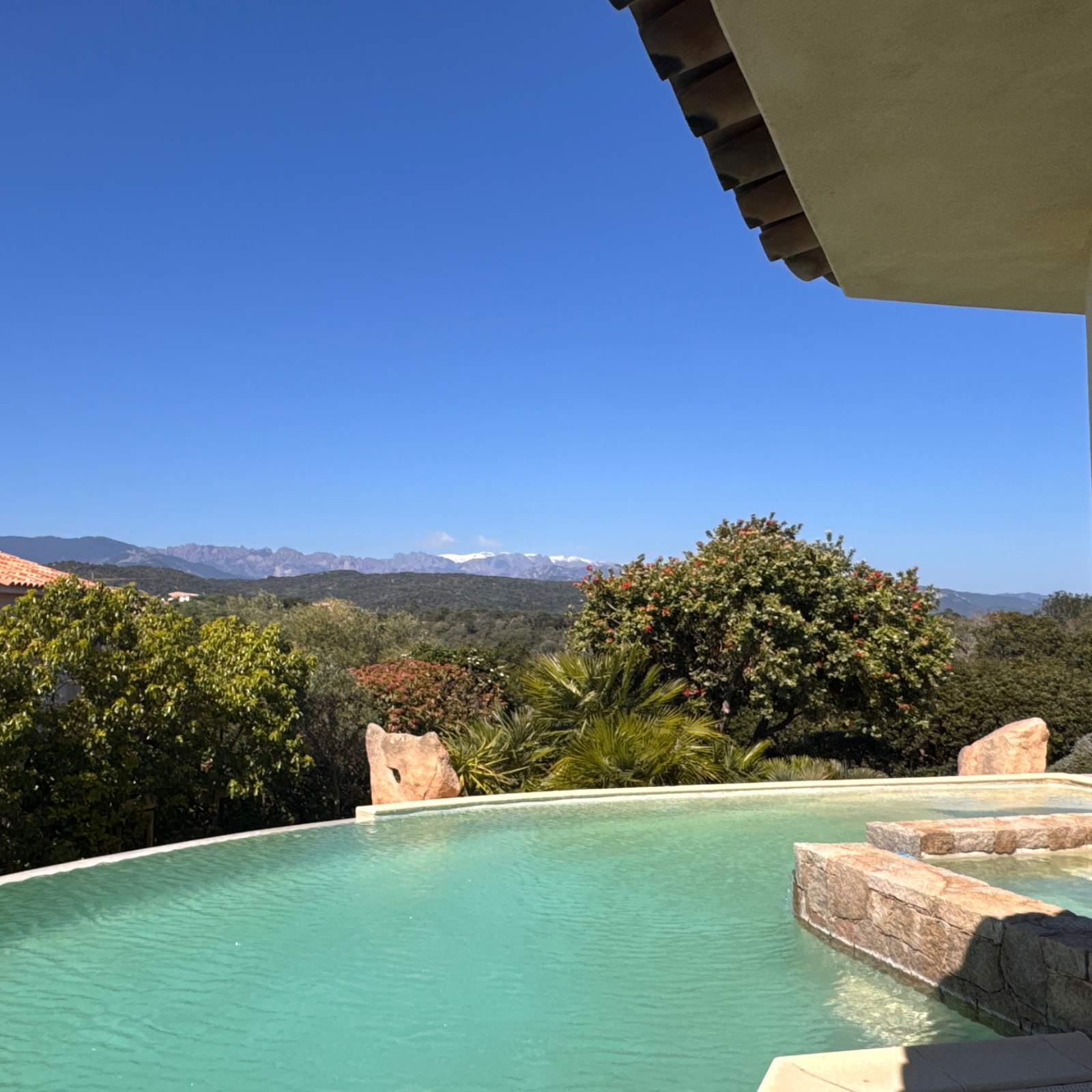 En position dominante, la villa offre une vue panoramique exceptionnelle sur la baie de Saint-Cyprien, le golfe de Porto-Vecchio, Pinarello et Capicciola. Un panorama dont on profite depuis chaque pièce.